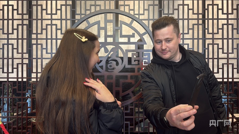 俄旅客试戴桦树皮发夹(央广网记者 庞淼 摄)