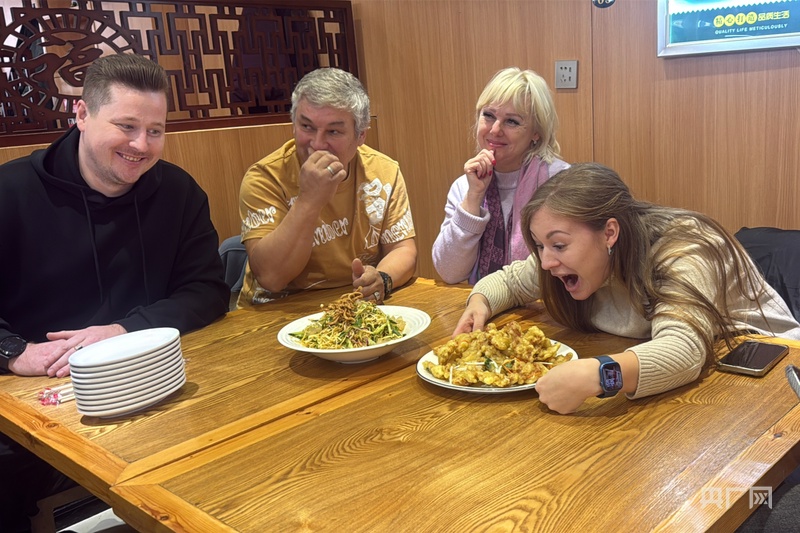 奥利亚(右一)一行体验中餐(央广网记者 庞淼 摄)
